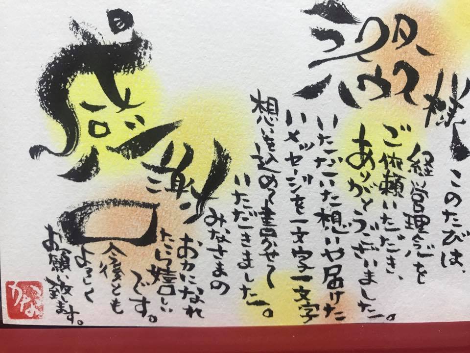 中村社長のお誕生日をみんなでお祝いしました! おめでとうございます 今年はラスターハウスの経営理念が新しくなりました。理念塾で学び、一生懸命考えてくれた社長へ、みんなで経営理念の額をプレゼントしました。 額は、私の同級生の妹さんで「心書」という、思いを字で表現する方にお願いしました。... メッセンジャー上で何度も話し合いをして、短期間で無理をお願いしてしまいましたが、素晴らしい作品にしていただきました! 蓮見可奈恵さん、ありがとうございました! https://m.facebook.com/shinshokana/ | カレンダー